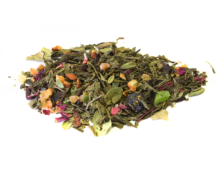 Зеленый чай "Сенча" / Брусника лист / Белый пион / Каркаде / Кожура шиповника / Яблоко / Цукаты / Роза / Персик / Вишня